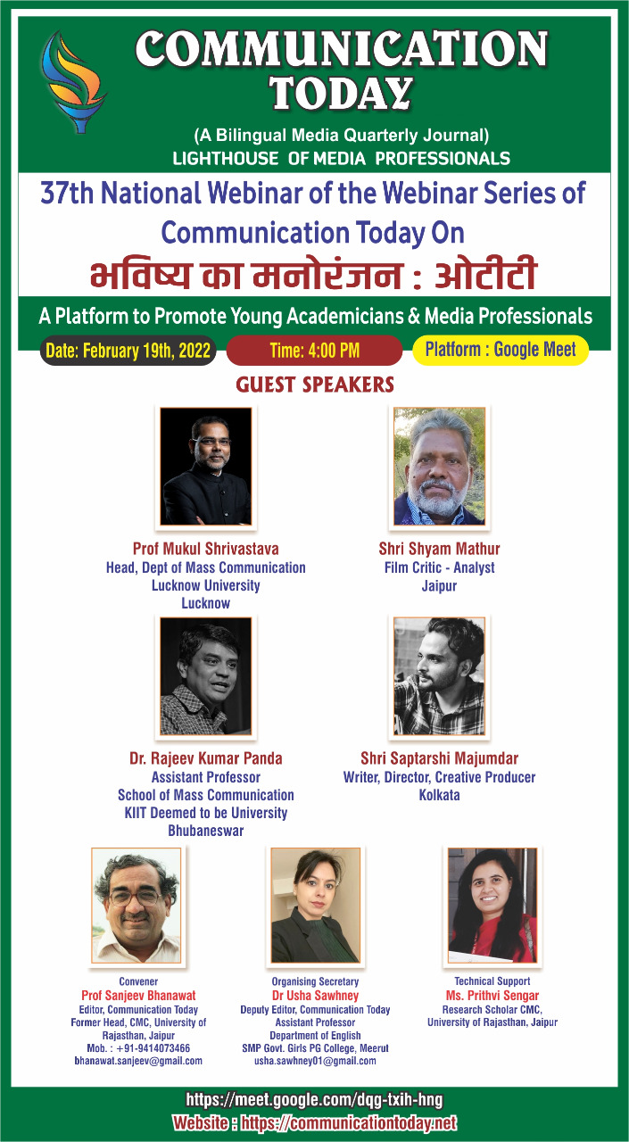 ‘कम्युनिकेशन टुडे’ के संपादक डॉ. संजीव भानावत ने बताया कि ‘भविष्य का मनोरंजन-ओटीटी’ विषयक इस वेबिनार में मीडिया से जुड़े विशेषज्ञ ओवर द टॉप (ओटीटी) कंटेंट से संबंधित रुझानों पर चर्चा करेंगे। प्रमुख वक्ता के तौर पर लखनऊ यूनिवर्सिटी के जनसंचार विभाग के हैड प्रो. मुकुल श्रीवास्तव, ‘सिने मीडिया अपडेट’ के प्रधान संपादक श्याम माथुर, भुवनेश्वर के मीडिया शिक्षक डॉ. राजीवकुमार पंडा और कोलकाता के लेखक-निर्देशक सप्तऋषि मजूमदार इस वेबिनार में टेलीविजन और सिनेमा देखने के रुझान में आए बदलाव का पता लगाने का प्रयास करेंगे।